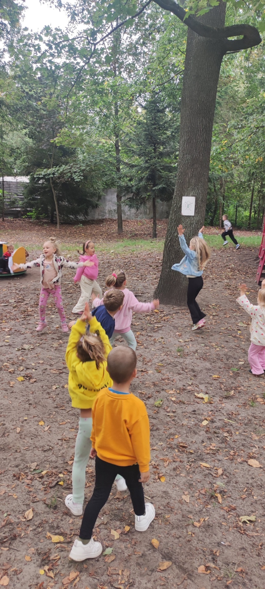 Korzystając z uroków złotej jesieni przedszkolaki aktywnie spedzają wolny czas w ogrodzie. Poprzez różnorodne zabawy doskonalą swą zwinność, zręczność i koordynację ruchową oraz wytrzymałość na wysiłek fizyczny.